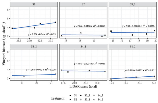 LiDAR scans versus vineyard biomass when analyzing data by treatment.
