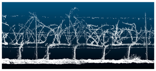 The LiDAR was installed to obtain the lateral projection of the vines because it provided the best information on the structure of the vines. Depth data was collected by setting the field of view to 270° at 0.5° angular steps and a sampling frequency of 50 Hz (every 20 ms). LiDAR readings were acquired and processed by a developed LabVIEW programme (National Instruments Co., Austin, TX, USA) [19]. Height profiles of the vines were obtained by distance extraction, generating a high-density point cloud containing all points where the laser beam impacted. The vehicle traveled in a straight line parallel to the row through the center of the inter-row area, so the raw data consisted of vertical slices of the vine surface. In this way, each cross-section comprised the intersection points between the laser beam and the vine. The distance between slices was about 5 mm.