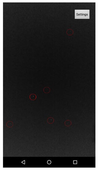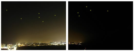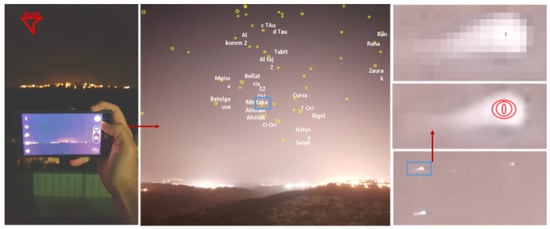 To evaluate the performance of the proposed algorithm, we conducted a set of field experiments. A preliminary version of the suggested algorithm was implemented as an Android app and tested on several Android smartphones. The main goal was to show that the proposed algorithm can work in real time on COTS devices which are not stationary (all images were captured while the phones were held in hand). At the first stage of the experiment, we simply tried to be able to capture stars. Figure 13 shows the ability of an Android device to detect stars in real time (5–10 fps video in 1080 p resolution, full high definition; FHD).