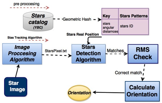 A mandatory phase of every star-tracking process is identifying the stars on a given image. Through identification, one is able to find the optimal matching (or registration) between each image star and the corresponding star in the database. Figure 2 shows the building blocks of the star tracker.