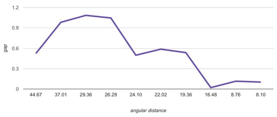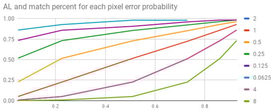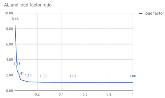 In all, the higher the accuracy, the greater the chance of missing similar patterns in the image frame. We consider this to be a good trade-off. Before determining the best to use, we performed some tests on the to simulate different scenarios. The First Test was done by counting the values for each key under various s. We used the database to create the hash table. The graph depicted in Figure 3 represents the probability of finding a star pattern of size 3 corresponding to the . For example, for an figure down to (load factor of ≈1), there is only a single candidate for each triplet; however, for an of , the load factor is ≈8.5.