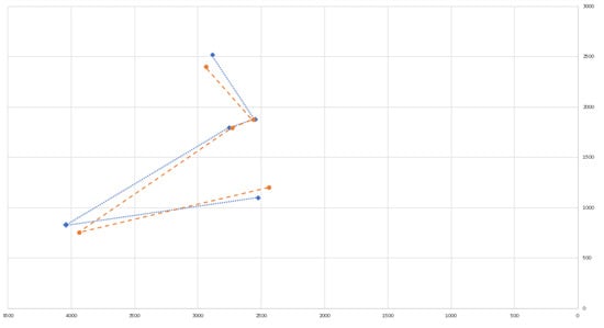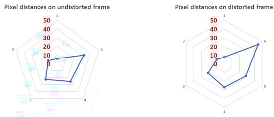 Distorted and undistorted frame distance deviations. Each pentagon in the graph represents a 10-pixel deviation from the real distance in the frame.