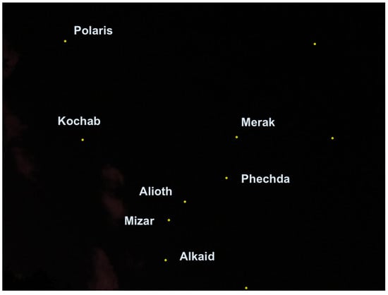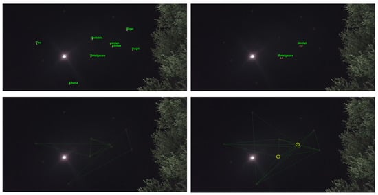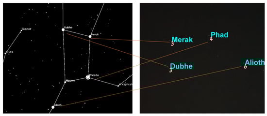 After having the ability to capture stars in real time, the application converts the star image to a list of star pixels. This list is fed to the algorithm that computes the star registration, as shown in Figure 14 in which the registration was performed with respect to the star data set. The star catalog () gives the stars’ positions, like any celestial object, in an equatorial coordinate system, meaning right acceleration and declination. Therefore, we first had to convert the stars’ angular distances as they appeared in the catalog to the pixels in the frame before the hashing process; we did so using the transformation described in the preliminaries [].