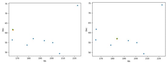 Orientation error example: the “Big bear” stars constellation in coordinates (angular). Left: a 0.3° error-accuracy, the estimates orientation is marked by an orange circle, in green - the real image-based pixel of the tested star (“Dubhe”). Right: a 0.1° error-accuracy, the estimates orientation is marked by an orange circle, in green, the real image-based pixel of the tested star (“ UMa”). The difference in the orientation accuracy is mainly due to the location of the tested star in the image. Stars within the 30° tends to have a sub 0.1° error angular rate.