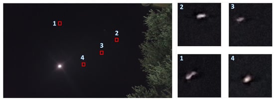 Finally, there is a need to discuss the accuracy of the results given possible inaccuracies in image processing. In this experiment, we used a simple super resolution to find each star-pixel center (in subpixels). Note that the average angular size of a star in the frame was [0.1°,0.2°]. Figure 15 depicts the typical way stars appear on the frame. The image process will allow us to improve the orientation accuracy about a single pixel ( degrees). Finally, the algorithm can improve the accuracy to a subpixel AL (lower than degrees) using multiple star matching and through time. The calculation of the star pixel can be done with great accuracy using one of the star-centroid algorithms []. Such algorithms can improve the star center to subpixel accuracy, which was shown to be as accurate as degrees []. We were unable to reach such accuracy in our preliminary smartphone implementation, so we conclude that the suggested algorithm was able to reach a pixel-level ( degrees) true orientation accuracy on calibrated smartphones.