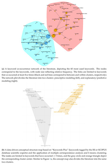 In order to further examine this apparent gap we have conducted a more formal bibliographic study. Based on the keywords and search strategy described in the Supplementary Materials Section, we identified 856 relevant documents (i.e., published articles, proceeding papers, and book chapters). To categorize these documents for this review, a text/bibliometric analysis was performed using the bibliometrix R package [12], with the goals of: (a) examining the co-occurrences of keywords within documents since this shows a link between the topics captured by these keywords; and (b) constructing a conceptual structure map of the literature based on a more streamlined keywords list (“Keyword Plus”, see [13] for a detailed introduction). The results are shown in Figure 1a,b, respectively.