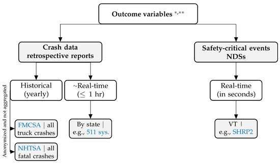 In retrospective case-control studies, the most frequently used outcome variable is crash counts. In the U.S., historical crash data are hosted by different Department of Transportation (DoT) divisions depending on: (a) the types of vehicles involved, i.e., commercial vehicles or personal commuter vehicles; and (b) whether the crash resulted in any fatalities. When these models are utilized/deployed for predictive purposes, real-time traffic data can often be used as model inputs. In the U.S., such data can be obtained from state specific reporting systems. For example, the 511 reporting system highlighted in Figure 2, is the predominately used sensing system in the U.S. since it is used by more than 45 states [18]. On the other hand, in prospective NDSs, the use of safety-critical events (SCEs) as a proxy outcome variable is more common since: (a) NDSs do not focus on crash-prone highways, (b) SCEs have a much higher incidence rate than crashes, and (c) they are assumed to be positively correlated with the incidence of crashes [16,19]. SCEs are defined as events that avoid crashes by last-second evasive maneuver(s) [16]. The most commonly studied SCE is “hard brakes”, which can be detected using accelerometers/inertial measurement units mounted in the vehicle or through a driver’s smart phone. The identification of a “hard break” is threshold dependent; for example, several studies equate a “hard break” to a deceleration higher than 3.0 m/s [20,21]. Several detailed reviews have been published on surrogate indicators using in the field of traffic safety [22,23,24]. It is important to note that, while SCE has been extensively used as the outcome variable in NDSs, its validity and causal relationship with crashes have not yet been conclusively confirmed [25,26]. We provide a visual summary of the hierarchical nature of the described outcome variables in Figure 2.