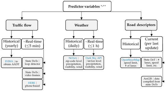Factors that have been shown in the literature to contribute to motor vehicle crash risk are discussed in detail in Section 4. Here we concentrate on strategies and sensing technologies used to obtain relevant data. From a data acquisition viewpoint, the sensors can be divided into [27]: (a) intra-vehicular sensing platforms, where conditions extracted from the vehicle are captured, and (b) urban sensing platforms, where the sensors are integrated in the road infrastructure. Intra-vehicular sensors can capture driver behavior, vehicle speed, traffic environment, etc. [28], and are widely used in NDS studies. On the other hand, urban sensing platforms are more commonly utilized in case-control studies.We can categorize such platforms into the following three categories: (a) traffic sensing systems (e.g., traffic cameras, inductive loop detectors, infrafred sensors), which can be used to estimate traffic flow, speed, occupancy, and volume [27]; (b) weather sensing systems, which can be used to compute/estimate important factors for both explanatory/predictive (e.g., visibility, rain/snow accumulation, and potential for icy conditions) and prescriptive modeling (e.g., wind direction and speed which are important considerations in hazardous material routing since they are used in predicting the severity of a possible crash through estimating the radius of dispersion of toxic materials); and (c) geometric road descriptors (e.g., number of lanes, speed limit information, longitudinal grade, road shoulder width, and whether the road segment of interest contains a straight, merge, and/or diverge sections), which are typically tagged in geographic information systems (GIS) and can be accessed using popular application programming interfaces (APIs) such as OpenStreetMaps [29,30]. A visual summary of predictor variables extracted from urban sensing systems is provided in Figure 3.