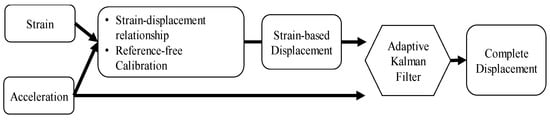 In addition to acceleration, reference-free displacement can also be reconstructed from a set of strain measurements based on strain-displacement relationships, such as modal transformations and geometric relationships [17,18,19,20]. Strain-based displacement methods reconstruct pseudo-static displacement very well, but the most critical part of transformation is to obtain the unknown location of a neutral axis that determines the magnitude of the resulting displacement.