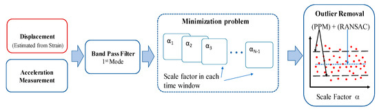 Reference-free calibration first applies a band pass filter to the acceleration and strain-based displacement measured at the mid-span point to extract the first-mode motions of acceleration and displacement. Next, the relationship between the second derivative of strain-based displacement from Equation (6) and the acceleration at the mid-span point is tuned to satisfy Equation (7).