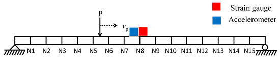 Numerical analysis was carried out by exciting the beam by a vertical moving load P with a velocity vp of 0.2 m/s, as shown in Figure 3. The material properties and dimensions of the beam are summarized in Table 2. The moving load P consists of a static load of 8 N and a zero-mean gaussian random component with a standard deviation of 3 N. The boundary conditions of beam is fixed. Simulations were conducted using MATLAB Simulink to generate strain and acceleration responses in the time domain at N8 (i.e., mid-span point of the beam model). Additionally, 10% root-mean-squared (RMS) noise was added to the acceleration, and four cases of 5%, 10%, 15%, and 20% RMS noise were considered for strain responses.