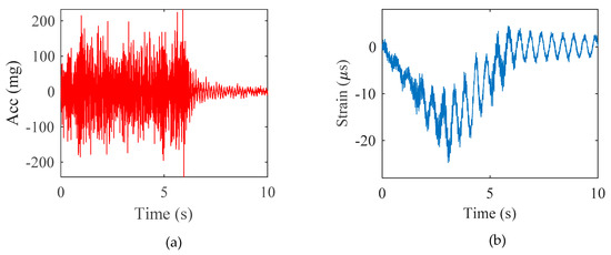 Figure 4 presents the acceleration and strain measured at the mid-span point. The strain was converted into displacement using geometric relationship in Equation (7) combined with reference-free calibration. The calibration factor was calculated to be 0.334 m for scaling the strain-based displacement. For calibration, the size of the time window Ns was set based on a standard windowing factor Fw of three and a target frequency for the first natural mode of the structure of 1.986 Hz. To eliminate outliers and identify the best values of α, the calibration factors were first filtered with an upper and lower limit of 0.8 and 1.2 times the PPM value [29], respectively, and RANSAC was performed with the data points and threshold for residuals set to Ns/6 and 0.001, respectively. A total of 10,000 iterations were calculated.