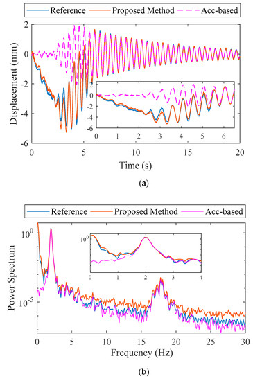 The displacement calculated by the proposed method and the reference displacement show good agreement in both the time and frequency domains. In time domain, the peak displacements from the proposed method and reference displacement were −5.18 mm and −4.929 mm, respectively, representing a discrepancy of only 4.84%. The acceleration-based displacement was only −2.06 mm based on the lack of a pseudo-static component in the displacement. In the frequency domain, the three dynamic displacements show good agreement with peaks at two natural frequencies. Pseudo-static displacement is clearly reconstructed in the results of the proposed method as shown in the zoom view of the Figure 5a,b.