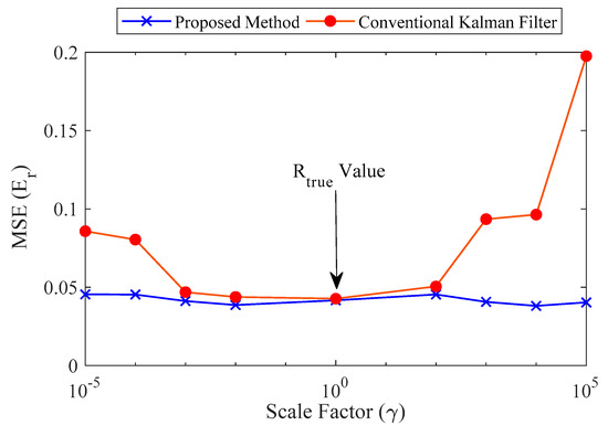 where is the standard deviation. Figure 6 reveals the stability of the proposed method compared to a CKF in terms of the noise covariance factor. The accuracy of displacement estimation is strongly affected by the choice of R for the CKF, but the displacement estimates generated by the proposed method show consistent error values over a wide range of values.