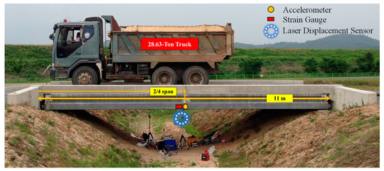 Sensors for measuring the bridge response were installed at the locations indicated in Figure 7. The strain gauge is installed at the mid-span point under the bridge and the accelerometer is installed in the same location. Note that the location of the mid-span point is 5.63 m from the left end of the bridge. To collect reference signals, a laser displacement sensor is also installed at the mid-span point of the bridge. The complete configuration is presented in Figure 7.