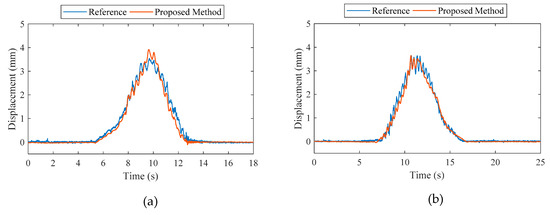 The proposed method was used to estimate the displacement at the mid-span point of the bridge. The calibration factor for the strain displacement relationship was computed to be 0.0373 m using the relationship discussed in Section 2.2. The forgetting factor for the AKF was set to 0.4 and the measurement covariance noise was initialized to a value of one. The estimated results were compared to the reference values measured by the laser displacement sensor for two different loading cases, as shown in Figure 8.