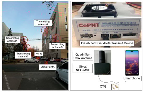 Fortunately, the pseudolite, which can generate and transit GNSS-like navigation signals [4,5] and has the advantage of flexible placement, low cost, and easy maintenance, is an essential supplement of GNSS and, recently, has been adopted in many areas like precision positioning, timing, and deformation monitoring of bridges [6]. For complex urban canyon environments, the addition of a pseudolite can significantly improve the availability of GNSS-like satellites and enhance the spatial geometry of GNSS [3], which is now a foundation of high-precision GNSS positioning [7,8,9,10]; therefore, the use of a pseudolite with good spatial distribution provides an important technique for high-precise positioning in a constrained environment. However, this distributed pseudolite heavily relies on highly precise time synchronization for every pseudolite [11], which requires the support of a complex time-synchronization device with dedicated manipulation; moreover, the larger multi-path error of the pseudorange and the ambiguity initiation require known coordinates with high precision, problems which urgently need to be solved [12,13].