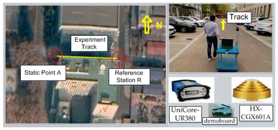 The reference station consisted of a HX-CGX601A GNSS choking ring antenna, and a UniCore-UR380 receiver modified to receive pseudolite signals was also deployed around the experiment field and marked in Google Maps [22] with a solid triangle as R (Figure 2). It was also equipped with a demoboard to obtain and disseminate an equivalent satellite clock error with 4G. A low-cost Ublox NEO-M8T receiver with a small quadrifilar-helix antenna was supposed to be used by users and was adopted in this experiment. In order to evaluate the noise of the GNSS and pseudolite in the urban canyon, the public user receiver was deployed at static point A with known coordinates; then, the kinematic test was performed to evaluate GNSS/pseudolite PPP when moving along the experiment track (yellow solid line marked in Figure 2). Finally, the PPP for public users was computed on a smartphone based on raw measurements from the Ublox receiver and equivalent satellite clock error received from the reference station. It is noteworthy that in the case of the equivalent satellite clock error being unavailable due to extreme conditions during 4G signal outages, these short-term faults during outages could be predicted using second-order polynomials by the smartphones of users.