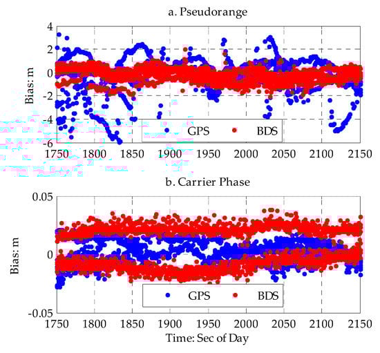 The double-difference of the pseudorange and carrier phase for zero baseline cancels out the common error, so the remaining residual errors represent the noise level [24]. This shows that the noise of the pseudorange and carrier phase measurement are better than 0.2 m and 8 mm, respectively, and there is no significant system error.