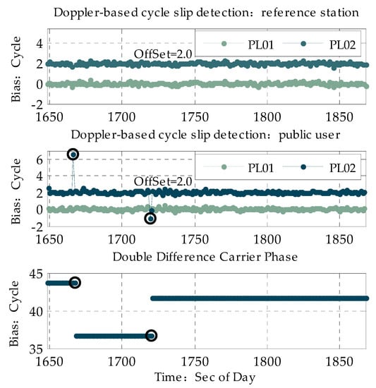 where u is the difference between the carrier phase difference and Doppler measurement; is the threshold for Doppler-based cycle slip detection. Once difference u is larger than , the corresponding satellite in the current epoch is marked as a cycle slip. The threshold of cycle-slip detection is related to the accuracy of Doppler and carrier phase measurements. As for the pseudolite measurement error analysis above, the accuracy of the Doppler and carrier phase measurements are no more than 2.1 cm and 3 cm/s, respectively, so the cycle slip of a carrier phase larger than one cycle can be detected considering that one cycle is four times larger than a measurement error of 16.88 cm. In order to assess the performance of the method mentioned above, the PL01 and PL02 pseudolites were selected as examples. To compare with the Doppler-based cycle slip detection method, the time series of the carrier phase double-difference after deduction of the geometric distance between the satellite and a reference station/user with a known position is shown, and the epoch when cycle slip occurs is marked.