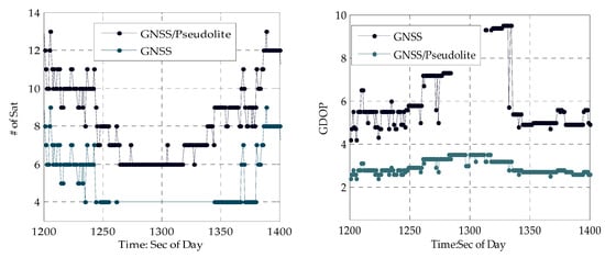 From Figure 5, it can be seen that when stepping from a normal urban canyon with low-density buildings to a deep urban canyon with high-density buildings, the number of GNSS satellites observed can decrease from nine to four, and the PDOP increases from 5.0 to 10.0 accordingly. When stepping into a terrible deep canyon with more high-density buildings around, PPP for users relying solely on GNSS fails when there are less than four GNSS satellites due to serious occlusion of GNSS signals by high-density buildings. When leaving the deep urban canyon, the number of GNSS satellites increases to nine, and PDOP decreases accordingly. Moreover, the number of GNSS satellites fluctuates greatly within a short time period, even in a normal urban canyon, so the GNSS PPP in an urban canyon is very difficult with frequency change of satellites and few GNSS satellites. Fortunately, the distributed-pseudolite provides continuous and sufficient GNSS-like satellites and solves the problem mentioned above. With four pseudolites in this area, the number of satellites increases to 13 and PDOP decreases to 2.2. Especially in the terrible deep canyon, accurate positions of public users can be obtained with four pseudolites available, as depicted in Figure 5 above.