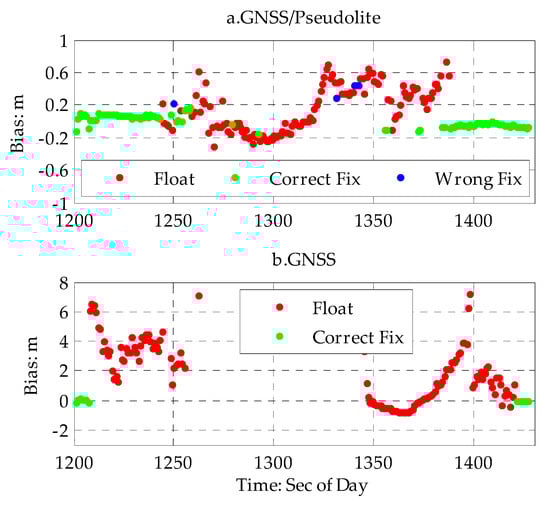 As shown in Figure 7 and Table 6 bellow, when moving from a normal urban canyon with low-density buildings, the integer ambiguity of GNSS and pseudolites can be easily fixed by having more GNSS satellite available. Due to minor occultation of the GNSS, the accuracy of the GNSS/pseudolite PPP can be better than 0.1 m with the initial integer ambiguity of GNSS and pseudolite determined. This result is consistent with that discussed above. When entering a deep urban canyon with high-density buildings with the pseudolite intimal integer ambiguity determined previously, a situation was simulated where it was assumed that there were no GNSS satellites are available due to heavy occultation of the GNSS, but the carrier phase measurement of four pseudolite could be tracked continuously. The accuracy of PPP based on these four pseudolites can be better than 0.441 m with the previously-determined initial integer ambiguity of the pseudolites under strong constraint. Afterwards, even if the ambiguity resolution fails when the ambiguity resolution validation is rejected or half cycle slip of the carrier phase occurs, the maximum height biases of PPP with only four pseudolites are not larger than 1.0 m. Otherwise, the advantage for this method is that it does not require a known point for ambiguity initialization and is very suitable for constantly moving public users in urban canyons. The larger fluctuation for pseudolite PPP and the low proportion of fixed solutions shown in Figure 7 are heavily correlated with the half cycle slip of the carrier phase of the pseudolite marked by the receiver itself, and the poor geometry distribution is due to there being less pseudolites available.