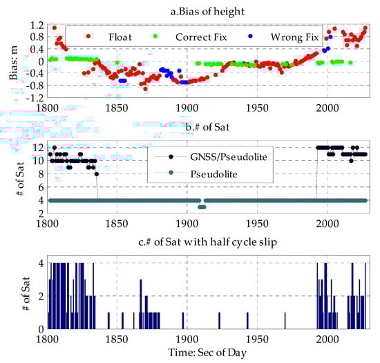 Time series of GNSS/pseudolite PPP based on simulation data. (a) time series of biases of height of GNSS/pseudolite PPP based on simulation data (top). (b) time series of the number of GNSS/pseudolite available (middle). (c) time series of number of satellite with half cycle slip (bottom).