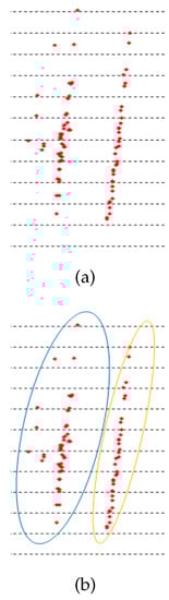 As shown in Figure 8a, there are many false points in the directly extracted road boundary candidate points. These false road candidate points are basically caused by weeds, trees, and stones outside the road. We propose a series of methods including point cloud classification, distance filter, and RANSAC (RANdom SAmple Consensus) to fit the boundary points. The specific process is described below. First, we classify the extracted point clouds, as shown in Figure 8b. The candidate points extracted follow the direction angle. According to the point cloud save order, if the point cloud meets the following conditions, it is the same class.