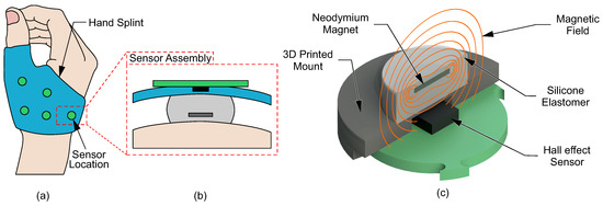 (a)The sensorised splint concept, (b) Placement of the sensor in the proposed splinting method, and (c) Components of the soft Hall effect tactile sensor: A neodymium magnet, silicone elastomer, and a three-axis Hall effect sensor.