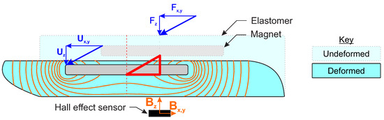 One modality which offers a promising solution to splint instrumentation is Hall effect-based tactile sensing. Through use of a moving magnet and a Hall effect sensor as a transducer method, a compliant and high performance tactile sensor may be produced. This method also allows for the electronics to be located on the exterior of the splint without direct contact to the sensing face. Wang et al. [13] presented a design methodology to produce a magnetic based tactile sensor, establishing a manufacturing protocol and calibration method to develop subsequent prototypes. Further to this, de Boer et al. [14] focused on the optimisation of this prototype, using finite element (FE) models to explore the magnetic and material properties of the MagOne. Computational optimisation of the design indicated the complex non-linear responses between applied forces and subsequent changes in magnetic field. This also highlighted that small variances in the geometric parameters of the elastomer could yield a large change in sensitivity in both normal and shear forces.