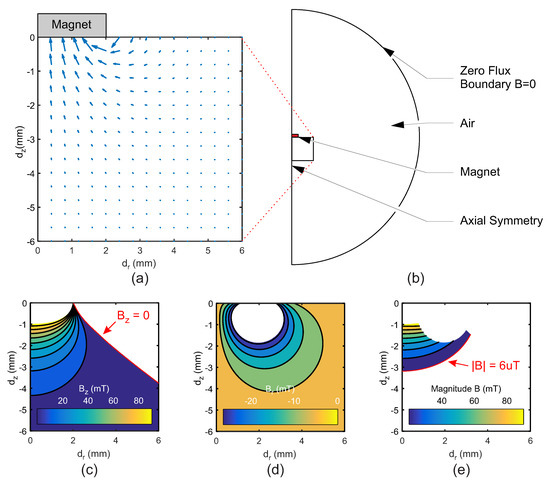 (a) Magnetic field vectors in an area of mm below the simulated magnet, used in the measurable area definition; (b) Geometry of the magnetic field simulation, indicating the domains and boundary conditions used; Areas of sensitivity in which the Hall effect sensor is in range in (c) (also indicating the inversion line where = 0); (d) ; and (e) Combined limits, magnitude (indicating the minimum accepted field magnitude at 6 uT). and represent the vertical and horizontal movement of the magnet, respectively. = 0 is the axis of rotational symmetry of the disc magnet.