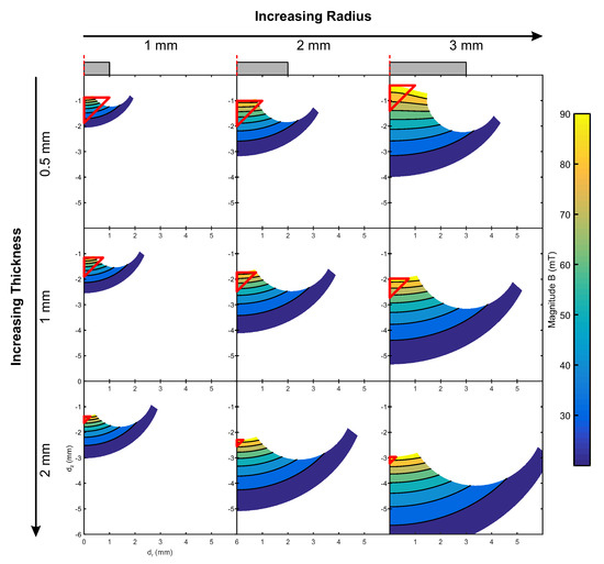 Figure 4 presents the calculated magnetic field strength from the two dimensional axisymmetric FE simulation, with the upper and lower bounds in and implemented. The field strength is presented as contour lines (T). The nine permutations of magnet size from Table 1 are presented and indicate the changing shape of the “measurable area” with magnet size. The size and position of the measurable area of magnetic field for a range of magnetic configurations. The measurable area varies as a function of magnet thickness and radius, as defined in Section 3.2. A working area is defined for each configuration, shown as a red triangle positioned at the point closest to the magnet where the entire working area is contained within the measurable area to ensure maximum sensitivity. From this analysis, the 2 mm radius, 0.5 mm thickness magnet was selected for mechanical analysis, as it showed the highest usage of the measurable area under working conditions.