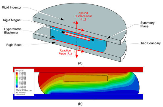 An FE model was produced to analyse the structural mechanics of the sensor. The simulation was used to evaluate the mechanical response of these elastomer configurations, thus enabling an appropriate geometry to be selected for the application. A full 3D representation of the sensor and indentation plates was produced for the simulation. In these models a vertical () and radial () displacement are applied to the top surface of the sensor (Figure 5a), and so the model was not axially symmetric. However, symmetry is present in the vertical plane in the direction of the applied shear, and so a symmetry condition was applied to reduce the overall complexity of the model. For the material properties of the elastomer, a third order incompressible Ogden model was selected based on existing research into the compressive properties of Ecoflex 00-30 [18]. As the stress across both the magnet and indentors were inconsequential for the final sensitivity of the sensor, they were modelled as rigid domains. The elastomer was tied to the surfaces of both magnet and indentors (Figure 5a) such that no slip or detachment occurred during simulation. A contact condition was also established between the elastomer and indentors to contain the expanding outer surface of the elastomer under higher stresses. The initial thickness of the elastomer layer below the magnet was selected from the output of the magnetic simulations to ensure the travel of the magnet covered at least 50% of the available signal from the sensor, leading to the selection of a 2 mm thickness base.