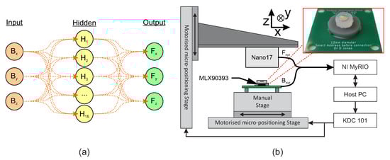 (a) Structure of the two-layer neural network used in the calibration; and (b) The multi-axis loading test setup , indicating two of the three linear stages used in the calibration. A third stage acts into the plane of the diagram to provide y-axis movement. A real-time measurement device is used to record magnetic field, applied force, and encoded position of the indentor. Inset: The prototype sensor used in calibration with 4 mm magnet embedded.