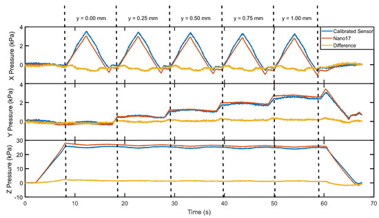 Figure 8 presents a comparison of the reference load cell output and the value from the calibrated sensor. The sensor was compressed to a maximum of 30 kPa, and sheared to a maximum of 3.4 kPa in the x and y dimensions, meeting the initial range requirement. The Root Mean Square (RMS) error in each axis was 0.36 (11%), 0.15 (4.5%), and 1.35 (4.8%), for the x, y and z measurements respectively. The RMS error in the x direction is greater than that of z and y, possibly because of inconsistencies in the calibration method. This is likely due to time related effects such as creep and hysteresis in the elastomer, as the x axis is constantly in motion throughout the test. RMS error in the z direction is consistent throughout the whole test. RMS in the y direction increases slightly with increasing displacement in y, but is consistent throughout each x sweep.