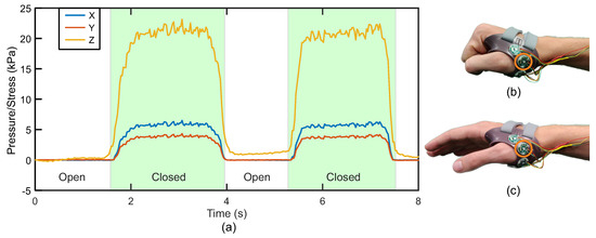 To indicate the sensor’s effectiveness within a splint, four sensors were manufactured and calibrated. These sensors were integrated into a commercially available hand splint (Thumb Brace, Push Ortho, The Netherlands). A single healthy participant wore the splint, opening and closing their hand (Figure 9b,c) multiple times in order to generate forces at the splint–skin interface. Pressures were measured and recorded at 50 Hz using a custom data acquisition system. Pressures of around 20 kPa and shear stresses of around 5 kPa were observed while the hand was closed, similar to the pressures reported from literature. While the individual sensor sizes are relatively large in this prototype, there is significant opportunity to miniaturise the system, through optimisation of sensing electronics and the elastomeric layer. This work will be informed by preliminary testing to better understand typical shear loading regimes which are currently not well understood.