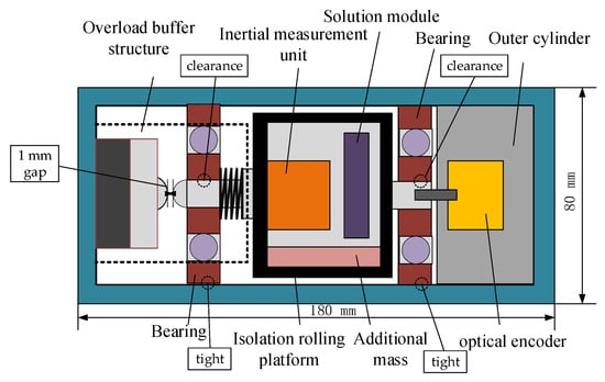Conventional ammunition plays an irreplaceable role in the modern battlefield [1]. With the development of technology and increasingly complex battlefield environments, the strike mode of traditional artillery has been replaced by precise strike, and various nations have begun to pay attention to studies on guided projectiles and extended range guided ammunition [2,3]. Guided ammunition, with a better precision and range than traditional ammunition, lower costs than conventional ammunition, and higher cost-effectiveness in general, has been widely adopted in modern warfare [4,5]. The precise measurement of navigation information parameters, such as projectile attitude, speed and location, is important for enhancing the precision of guided ammunition. Affected by dimensions and severe environments, it is difficult to apply advanced navigation means, including high-precision inertial components like fiber-optic gyroscopes and image matching, in guided ammunition [6]. Due advantages such as its small size, anti-high overload capacity, strong autonomy, and high reliability, an inertial measurement system based on micro-electro-mechanical system-based inertial components has become an essential navigation component in the guidance process of rotating ammunition with high overload, high impact and short flight time [7,8,9]. However, because of its manufacturing technique, its measurement range and precision are not matched with each other; thus, the attitude of the ammunition when rotating at a high speed cannot be accurately measured by a traditional strapdown inertial navigation system [10]. A gyroscope-free strapdown inertial navigation system is suitable for inertial navigation with a large dynamic range, whereas the angular velocity is obtained from accelerometers’ specific force signals, so the calculated quantity is large and the calculation error quickly accumulates over time, further decreasing accuracy [11,12]. Rotation modulation technology provides stable operating environments via a servo motor. However, because the servo motor has poor resistance to high overload, so the system can only be applied in rocket projectiles with low overload and in high speed rotation [13]. Regarding the limitation of strapdown inertial navigation, the proposal of a passive strapdown inertial navigation system provides a better solution. The micro-inertial measurement unit (MIMU) in the isolated rolling platform of the system maintains a strapdown with the projectile on the pitch and yaw axes. By isolating the projectile’s rolling movement via a mass eccentricity device and bearing, the isolation rolling platform remains stable along the direction of the rolling axis, thus providing an appropriate application environment for MEMS inertial components with a low measurement range and high precision [14,15,16]. The normal operation of the bearing is critical to the rolling of an isolation projectile. However, the anti-overload performance of a bearing is extremely low and easily damaged in the moment of the launch of the ammunition or the in the boosting stage by boost engine because of high overload; thus, a reliable high overload buffer device is of significance to the normal operation of this system.