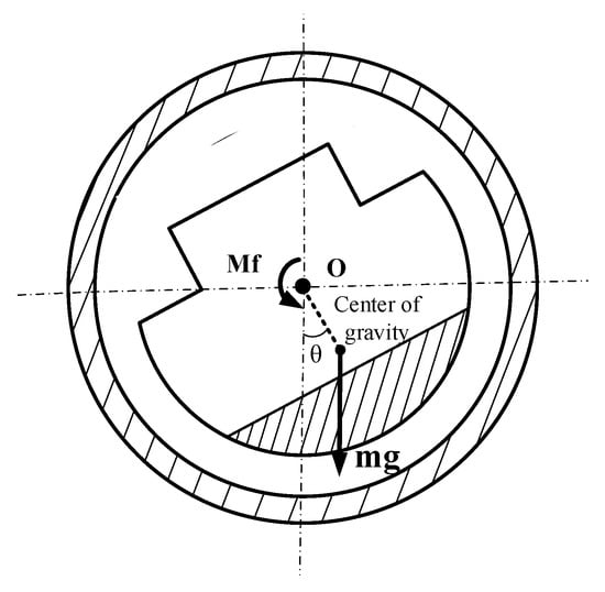 The core part of passive semi-strapdown inertial navigation measurement unit is the isolation rolling platform, which is designed based on the compound pendulum movement under gravity, the remaining strapdown with the projectile in pitch and yaw bearing, and connection with the projectile in rolling axis via bearing; its mechanical model is shown in Figure 2. The isolation rolling platform retains the stable compound pendulum movement in a balanced position under the friction torque between the gravity restoring torque and the bearing friction torque so as to reach the high-speed rotation of the isolation projectile and provide an appropriate measurement environment for the MIMU with a low measurement range and a high accuracy [21]. The outer cylinder is installed with an optical encoder to measure the relative the angle between the isolation rolling platform and the projectile on the rolling axis [22]. The inertial measurement unite can realize the measurement of movement parameters and the real-time solution of the navigation algorithm on the navigation computer.