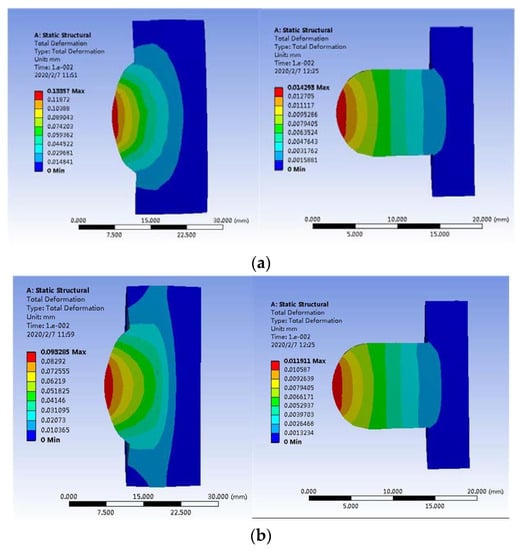 In order to simulate the deformation state of the upper and lower spherical caps after the moment of launch, a mechanical simulation was performed. The finite element method was used to establish the simulation model of the point contact spherical cap structure before and after optimization, as well as reasonable free mesh generation. According to the actual projectile environment, at the moment of launch, the projectile must withstand an overload of 12,000 g, because the lower spherical cap is connected to the projectile via the outer cylinder in a fixed way. According to Newton’s second law F = ma, the overload can be made equivalent to the isolation rolling platform by applying the same amount of load force to the lower spherical cap through the upper spherical cap [20]. If the mass of the isolation rolling platform is 1 kg, the equivalent load force is 117,600 N. Figure 6 shows the cloud distribution of the amount of deformation in the upper and lower spherical caps.