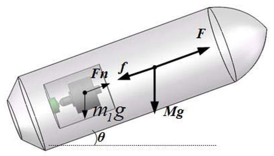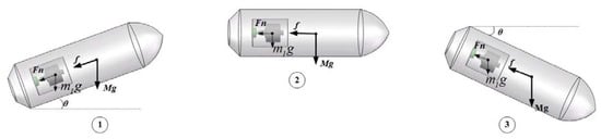 During the inertial free flight phase, the projectile is mainly affected by aerodynamics and gravity, of which only the air resistance and the component of projectile gravity force in the axial direction. As shown in Figure 7, f is the axial air resistance of the projectile, M g is the gravity force acting on the projectile, F n is the support force of the projectile on the isolation rolling platform in the axial direction, m 1 g is the gravity force acting on the isolation rolling platform, and θ is the projectile pitch angle.