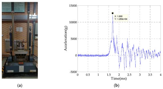 Figure 11. The scene diagram of impact test. (a) System installation photo and (b) impact table feedback waveform.