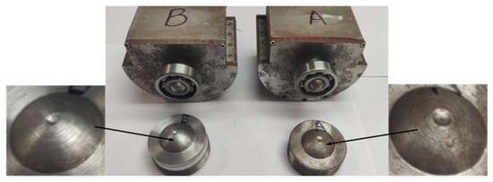 After the impact, the bearings of both systems rotated smoothly without damage. The deformation of the upper spherical caps of both systems was very small and could be ignored, while the deformation of the two lower spherical caps was quite different. The deformation of the lower spherical cap of system B was significantly smaller than that of system A. After the measurement, the deformation of system A was about 0.15 mm, and its maximum deformation radius was 1.79 mm. However, the deformation of system B was only 0.09 mm, and its maximum deformation radius was 1.06 mm, which was basically consistent with the simulated structure. Since the maximum deformation radius of the lower spherical cap of system B was 40.8% smaller than that of system A, it could greatly reduce the pivoting friction that is generated by the contact between the two spherical caps during the in-bore launch phase.