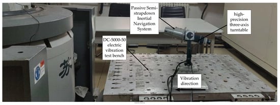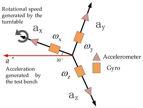 Secondly, to verify the stability of the isolation rolling platform after impact, that is during the out-bore flight phase, this test used a high-precision three-axis turntable to provide the system with axial angular velocity to simulate the projectile’s high-rotation environment during flight. According to the acceleration simulation curve of the projectile during the out-bore flight in Figure 9, the acceleration of the projectile during the boost phase could reach 3.32 g, whereas the acceleration of the ground vehicle was much lower than 1 g. Therefore, a DC-5000-50 electric vibration test bench was used to provide the system with linear acceleration to simulate the projectile’s acceleration during the engine boost phase. The two passive semi-strapdown inertial navigation systems before and after optimization were installed on the high-precision three-axis turntable spindle, the turntable pitch angle was set to 30°, and then the high-precision three-axis turntable was fixed to the vibration bench surface, as shown in Figure 13 and Figure 14 is a schematic diagram of the orientation of the sensors inside the isolated rolling platform; among them, the accelerometers and gyroscopes on three axes were orthogonal to each other.