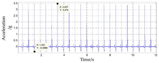 After the system was powered on, it was set at rest for 10 s to ensure that the internal sensors worked stably. Then, the vibration bench was started, the turntable spindle was set to rotate counterclockwise at an angular rate of 3600°/s, and the vibration bench was set to perform a half-sine wave vibration in the horizontal direction at a frequency of 2 Hz and a vibration amplitude of 4 g. The acceleration component of the vibration bench in the system spindle direction is shown in Figure 15, and the direction was upward along the system axis. The force analysis of the internal isolation rolling platform is shown in Figure 16.