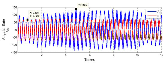 Figure 18 shows the feedback waveform of the spindle angular rate sensors of systems A and B. According to the angular rate output curve, under the system spindle’s rotation at an angular rate of 3600 °/s and an acceleration range of −0.39 to 3.47 g, the internal isolation rolling platforms of systems A and B performed compound pendulum movement. The difference was that the angular rate of the internal isolation rolling platform of system A was reduced to a maximum of 140.3 °/s and fluctuated continuously, which indicated that system A was affected by torque in addition to the gravity restoring torque and the bearing friction torque—the pivoting friction torque that was generated by the contact of the upper and lower spherical caps, which caused the amplitude of the compound pendulum to continuously change and the angular rate to change accordingly. However, the angular rate of the internal isolation rolling platform of system B reached a maximum value of 67.26 °/s, and the angular rate change curve was stable, which indicates that the isolation rolling platform only performed the compound pendulum movement under the gravity restoring torque and the bearing rolling friction torque.