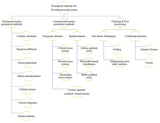 We first introduce the available procedural methods which can directly generate new texture images. With respect to the textures generated by the procedural models, we considered whether the result texture is structured or unstructured. The pattern generated defines the texture pattern and sets the properties of the surface. A structured texture has a structured pattern with some appearance of regularity, while an unstructured texture has irregular primitives with the appearance of randomness.