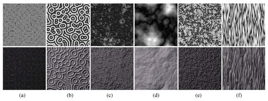 We briefly introduce each method together with texture examples with varied appearances, which the method can produce by changing the input parameters. Moreover, using previous surveys related to texture generation [,,,] along with 2D static texture examples, we also show surface height maps and their rendered results produced by these methods. We are particularly interested in those methods that can generate rough surface textures which appear similar to real-world surfaces. Finally, we describe the characteristics of these models, based on the results of psychophysical experiments.