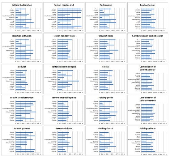 For each texture generation method, a characteristic description was quantitatively defined by using the average of the normalized Likert scale of all samples generated by the method. It should be noted that this can only be seen as a rough guide for general use, as the perceptual features of different textures generated by the same method could be slightly different.
