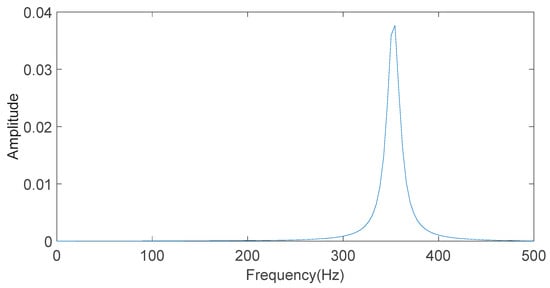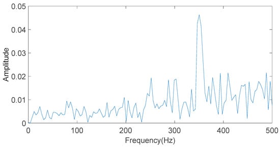 As shown in Figure 5, the energy of the simulation signal is mainly concentrated in the high-frequency component. The IMF1 component has the largest energy value, which is regarded as the dominant characteristic component. The time-domain diagram of the IMF1 component is shown in Figure 6. FFT is used to analyze the IMF1 component in order to calculate the frequency of the component. The result is shown in Figure 7. From Figure 7, it can be found that the signal part with a frequency of 350 Hz is mainly concentrated in the IMF1 component.