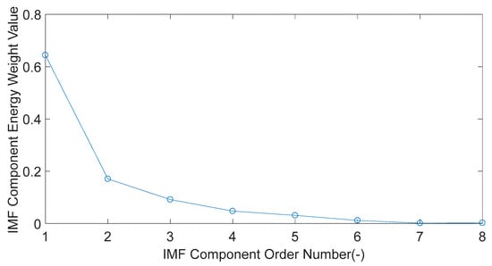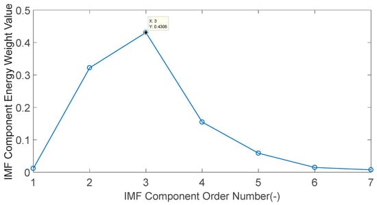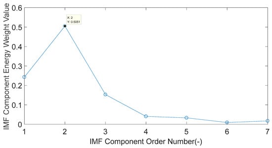 The energy weight value of IMF components in order 1–7 is calculated, and the results are shown in Figure 13. As shown in Figure 13, the energy weight value of the IMF2 component accounts for 50.51% of the total energy, which is the dominant characteristic component.